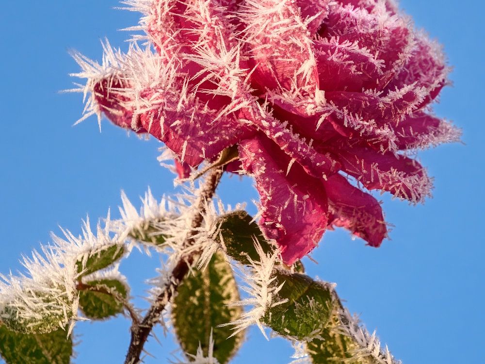 Rosa Rosenblüte mit weißen Raureifkristallen vor blauem Himmel an einem kalten und sonnigen Wintertag