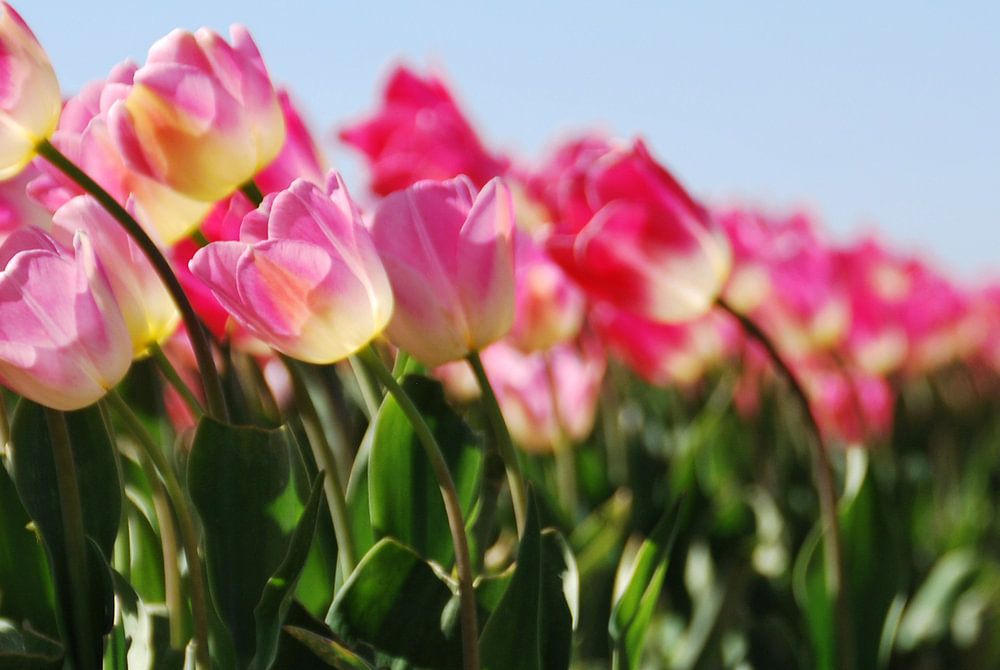 Die Tulpenfelder in den Niederlanden stehen in Blüte.