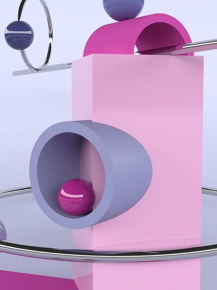 Dreidimensionales (3D) abstraktes Design aus Grundformen in den Farben Rosa und Lila. Fröhliche und bunte moderne Kunst. Auch in anderen Farben nach Wunsch erhältlich.