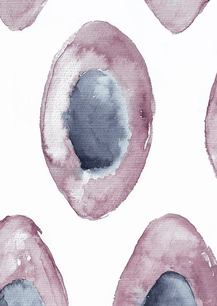 Dieses abstrakte Aquarell zeigt eine Reihe von ovalen Formen, die in einem lockeren, organischen Muster angeordnet sind. Jedes Oval ist durch weiche, gedämpfte Mauve- und Grautöne definiert, mit dunkleren grauen Zentren, die ein Gefühl von Tiefe und Kontrast erzeugen. Die Formen haben eine durchscheinende, geschichtete Qualität, die für Aquarelltechniken charakteristisch ist und der Komposition einen zarten, luftigen Charakter verleiht. Das minimalistische Design in Verbindung mit der Wiederholung der Formen ruft ein Gefühl von Rhythmus und Harmonie hervor, während die gedämpfte Farbpalette zu der ruhigen und meditativen Atmosphäre des Kunstwerks beiträgt.