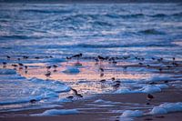 Die Sonne ist am 19. Mai 2021 am Strand de Voordijk zwischen Callantsoog und Groote Keeten fast untergegangen. Sanderlinge und Austernfischer nutzen das letzte Licht, um kleine Steine und andere Nahrung aus dem Sand zu sammeln.