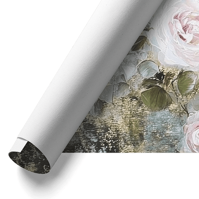 Rose Art - Dieses Blumengemälde zeigt eine lebendige Sammlung von Rosen in verschiedenen Rosa-, Weiß- und Rottönen, die durch goldene Akzente auf einem sanften blaugrauen Hintergrund ergänzt werden und eine reiche, luxuriöse und romantische Atmosphäre schaffen.