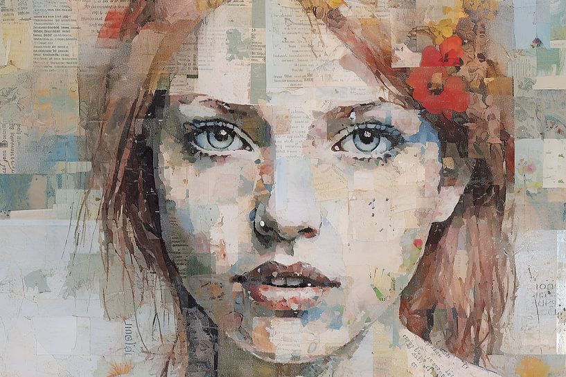 Rose Portrait - abstrakte Malerei / Mixed Media Art gemalt. Schöner Kontrast zwischen anspruchsvollem Portrait und roher Collage/Maltechnik.