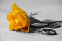 gelb blühende Rose mit zwei Eheringen als Zeichen der Liebe und der Zuneigung zweier Menschen zueinander