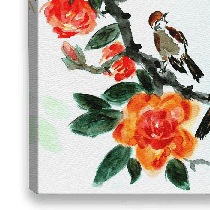 ein farbenfrohes Kunstwerk von roten und orangen Rosen mit kleinen Spatzen die auf den Zweigen der Blüten sitzen.