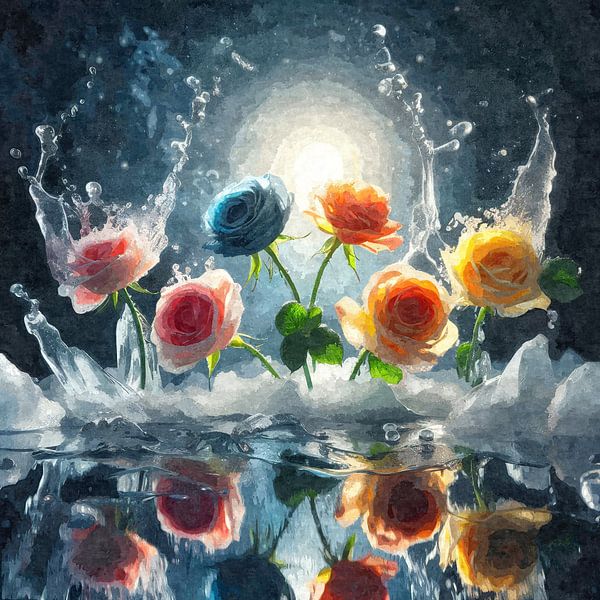 Fünf Rosen in Pink, Rot, Blau, Orange und Gelb erheben sich aus einer spritzenden Wasseroberfläche. Die dynamischen Tropfen und Spiegelungen verstärken die Intensität der Farben, während ein strahlendes Licht im Hintergrund die Szene in eine magische Aura taucht.