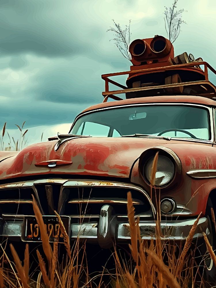 Ein altes, rostiges Auto, das inmitten von hohem, trockenem Gras unter einem dramatischen Wolkenhimmel geparkt ist. Eine Szene voller Nostalgie, Abenteuer und zeitlosem Verfall.