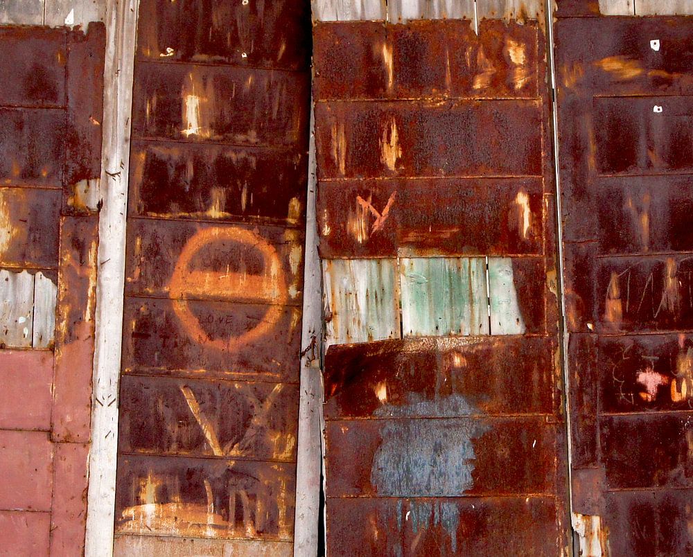 Abgelaufene Türen in einem Bogen an einer verlassenen Thunfischfalle in Sizilien. Schöne tiefrote Rosttöne gegen das verwitterte Holz und auch die Sandsteinwände regen die Phantasie an.