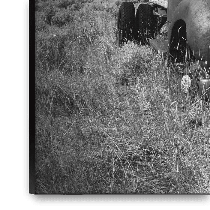 Rostiger alter Pick-up-Truck (in Schwarz-Weiß) am Rande des Highways in Kanada. Aufgenommen während eines Roadtrips durch Westkanada.