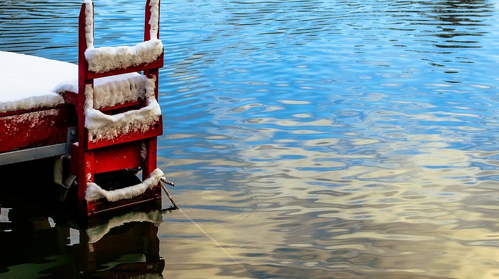 Rote Leiter an einem verschneiten Steg, umgeben von gold-blauen Himmelsreflexen auf sanften Wellen. Ruhig, klar, nordisch.