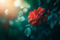 Leuchtend rot und von sanften Tropfen umgeben, entfaltet sich diese Rose inmitten eines geheimnisvollen, grünen Hintergrunds. Ihr strahlendes Farbspiel und die zarten Blätter bringen lebendige Frische in jeden Raum und eignen sich besonders gut für das Schlafzimmer. Hier schafft sie eine romantische Atmosphäre und lädt zum Träumen ein.