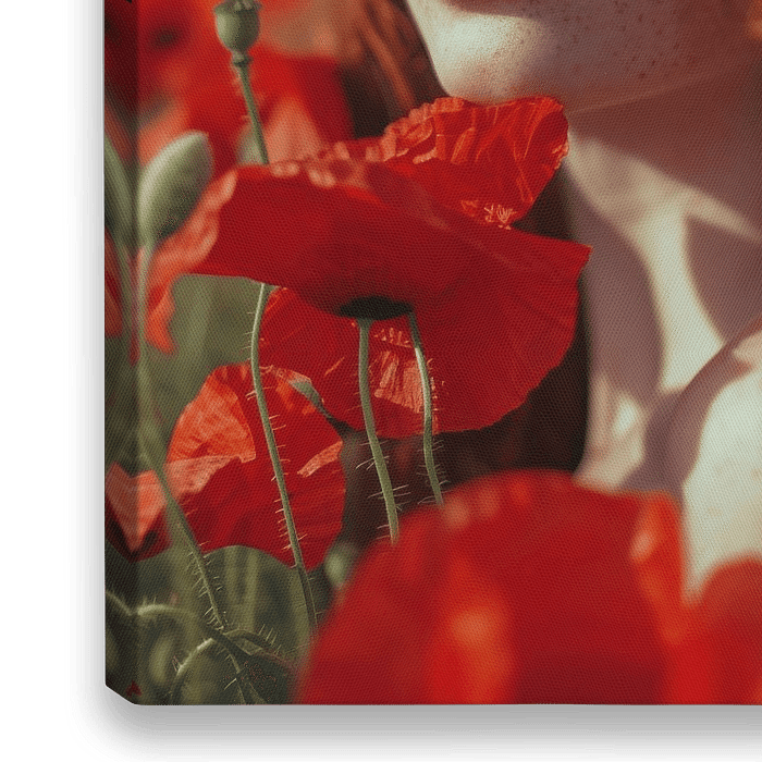Das Bild zeigt eine eindrucksvolle junge Frau mit strahlend rotem Haar, umrahmt von leuchtend roten Mohnblumen. Ihre Gesichtszüge sind sanft und von zahlreichen Sommersprossen geziert, was ihrer Ausstrahlung eine besondere Lebendigkeit verleiht. Der Kontrast zwischen dem blauen Himmel und den roten Blumen verstärkt die emotionale Tiefe…