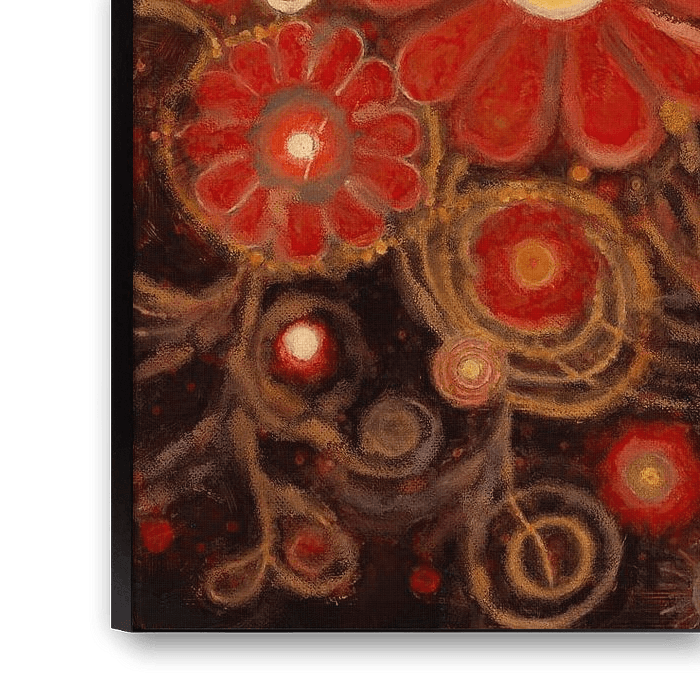 Dieses Werk zeigt eine leuchtende Sammlung roter Blumen vor einem Hintergrund aus warmen Goldtönen. Die Blumen sind in verschiedenen Größen und Stilen detailliert dargestellt, wodurch eine dynamische und verspielte Komposition entsteht. Die Kombination aus kreisförmigen Mustern und Spiralen verleiht dem Ganzen zusätzliche Tiefe und Bewegung.