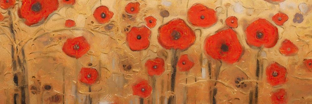 Dieses Werk zeigt eine Fülle von leuchtend roten Blumen, die sich anmutig über einen warmen, beigen Hintergrund erstrecken. Die intensiven Rottöne der Blumen bilden einen schönen Kontrast zu den weichen, erdigen Tönen des Hintergrunds. Die feinen Details in den Blütenblättern und Stängeln verleihen dem Werk ein Gefühl von Tiefe und Textur. Diese Komposition bringt ein Gefühl von Lebendigkeit und Energie in jeden Raum und eignet sich sowohl für moderne als auch für klassische Innenräume. Das Werk verleiht jedem Raum einen Hauch von natürlicher Schönheit und Farbe und eignet sich perfekt zur Aufhellung.