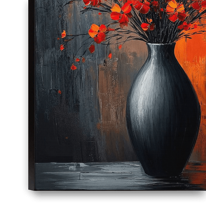 Rote Blumen - Dieses Blumenbild zeigt einen üppigen Strauß orangefarbener und roter Blumen in einer eleganten dunklen Vase vor einem Hintergrund mit leuchtenden horizontalen Streifen in Orange- und Grautönen, die ein Gefühl von Wärme ausstrahlen.