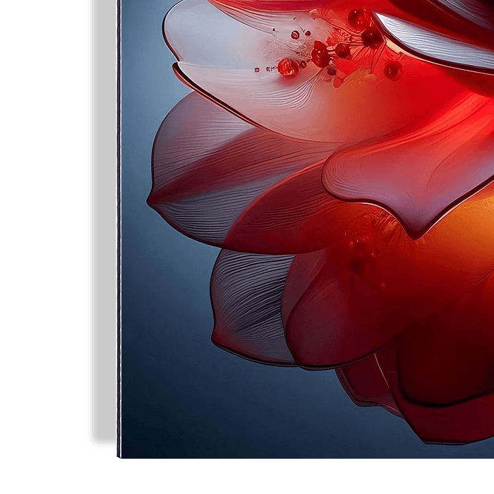 „Rote Glasrose“ ist ein leuchtendes digitales Kunstwerk, das die Eleganz der Natur mit glasartigen Texturen verbindet. Im Mittelpunkt steht eine lebendige rote Rose mit durchscheinenden Blütenblättern, die wie geschmolzenes Glas wirken – zart und zugleich kraftvoll. Jeder Blütenblatt ist mit filigranen Lichtreflexen und einem sanften Farbverlauf von tiefem Karmesinrot bis zu zartem Rosa gestaltet und bildet eine ätherische Blume, die vor einem dunklen Hintergrund strahlt.