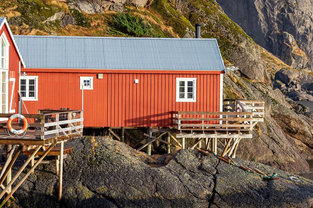 Rote Holzhütten auf Stelzen am Wasser auf den Lofoten in Norwegen.