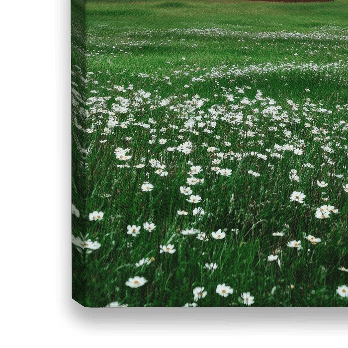 Ein einsames rotes Haus erhebt sich majestätisch aus einer grenzenlosen Wiese, die von zarten weißen Blumen durchzogen ist. Der Himmel schweigt in tiefen Grautönen und hüllt die Szene in eine geheimnisvolle Stimmung. Stille umgibt den Ort, als ob die Natur selbst den Atem anhält, während die Wolken drohend über dem Horizont schweben.