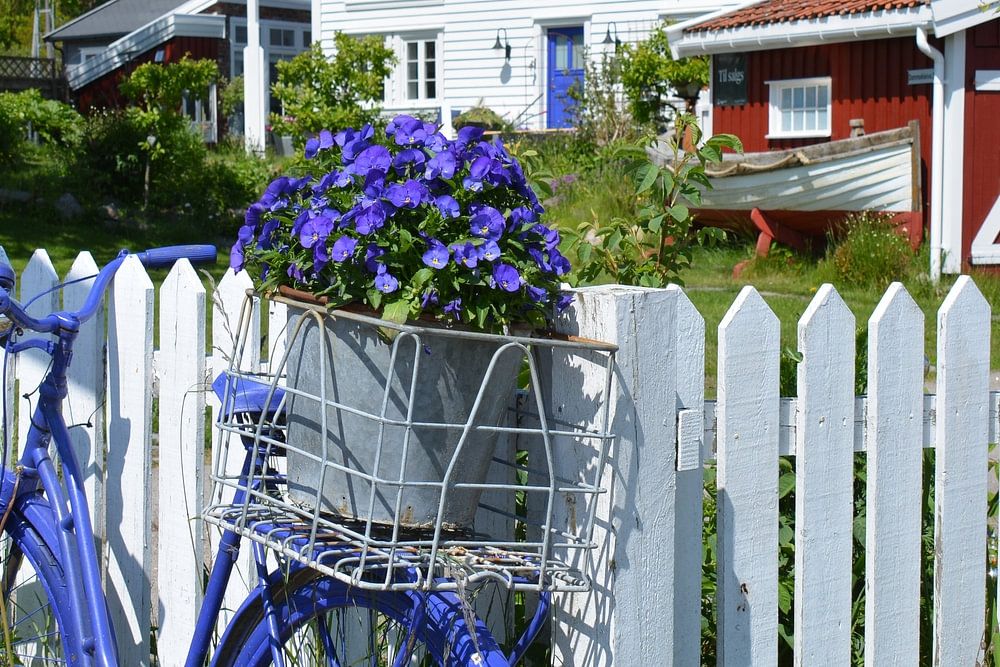 In einem kleinen Dorf an der Südküste Norwegens stieß ich auf diese typisch norwegische Szene. Ein kleines rotes Haus in Norwegen mit weißem Zaun, blauem Fahrrad und Blumen.