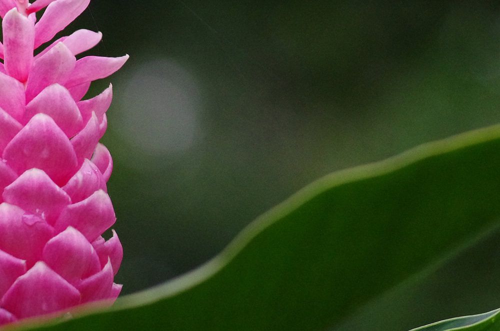 Nahaufnahme der rosa Blüte der roten Ingwerpflanze (Alpinia purpurata), die in Mittelamerika und Asien vor einem verblassten Hintergrund wächst.