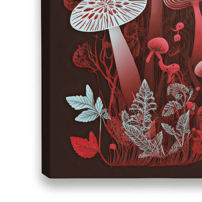 Eine halb-abstrakte Illustration für ein Kinderzimmer, die die Fantasie anregt. Das Kunstwerk zeigt eine verzauberte Waldlandschaft mit roten Pilzen in verschiedenen Formen und Größen. Der dunkle Hintergrund verleiht dem Werk eine verträumte Atmosphäre.…