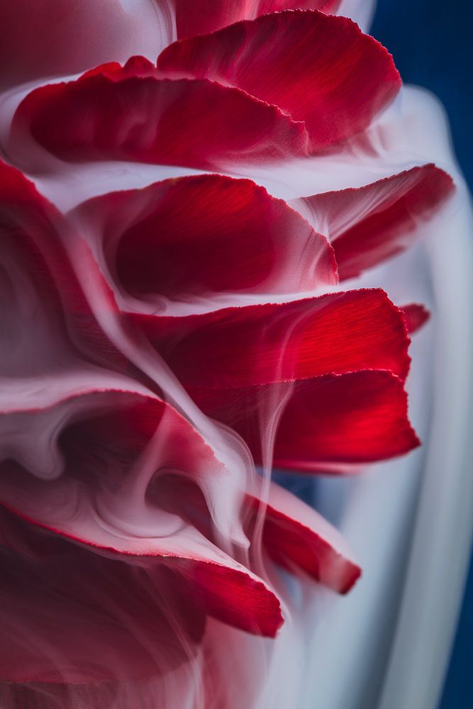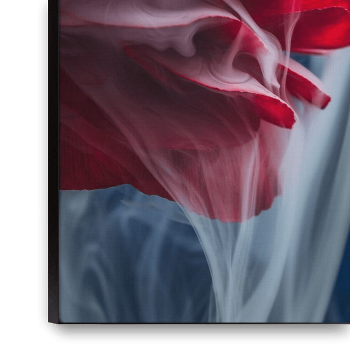 Bestelle dieses abstrakte Wandbild Rote Ranunkel mit weißem Rauch, der über die zarten Blätter strömt von Marjolijn van den Berg als Reproduktion auf Leinwand, Alu-Dibond, als Poster, Fototapete oder Acrylglasbild.