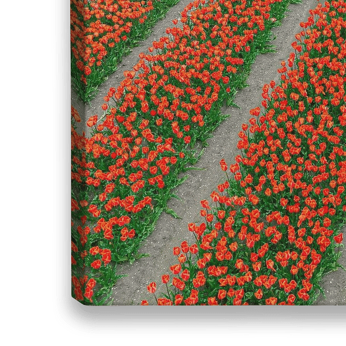 Rote Tulpen, die in langen Reihen auf landwirtschaftlichen Feldern im Noordoostpolder in Flevoland, Niederlande, im Frühling wachsen. Der Noordoostpolder ist ein Polder in der ehemaligen Zuiderzee, der ursprünglich angelegt wurde, um mehr Land für die Landwirtschaft zu schaffen, und ist eines der größten Anbaugebiete für Blumenzwiebeln in den Niederlanden...
