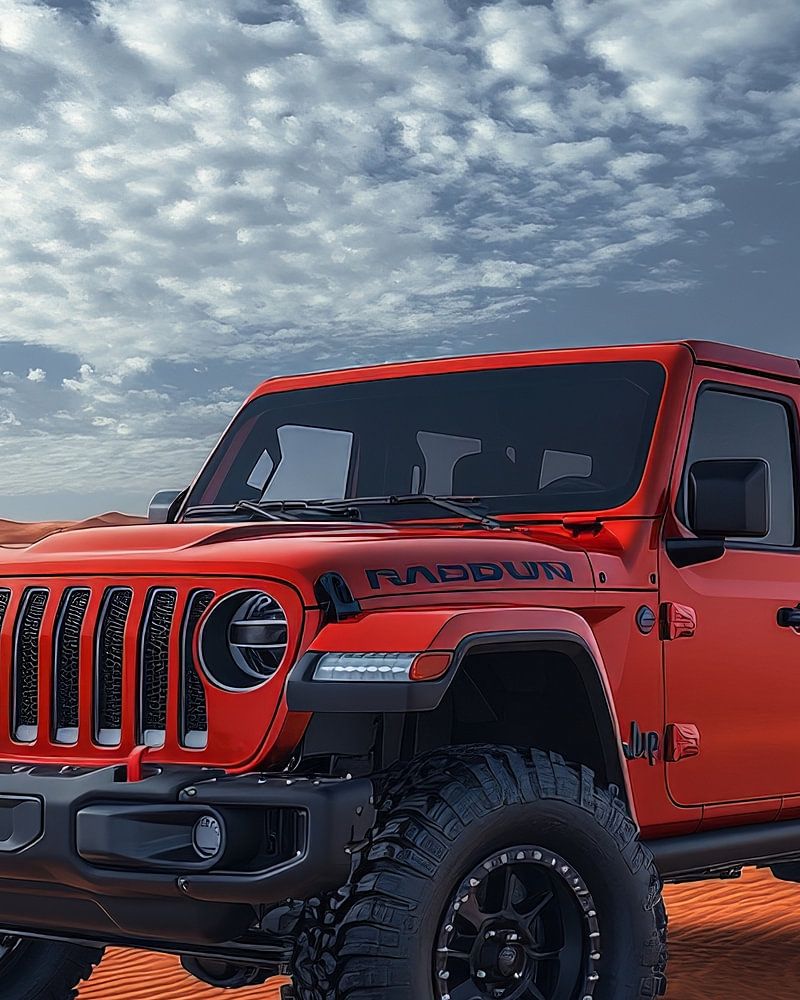 Ein roter Jeep Wrangler fährt unter einem feurigen Sonnenuntergang durch die weitläufigen Wüstendünen und wirbelt goldenen Sand auf, während er sich einen Weg durch die raue Wildnis bahnt. Ein kühnes Symbol der Freiheit, der Kraft und des Entdeckergeistes.