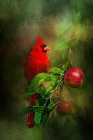 Das Foto eines roten Kardinals wurde digital bearbeitet auf einem schönen, gemalten Hintergrund eines Apfelbaumzweigs mit roten Äpfeln.