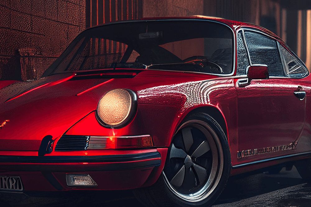 Genießen Sie die Atmosphäre einer regnerischen Nacht mit diesem Bild eines roten Porsche 911 auf einer Straße kurz nach einem Regenschauer! Dieses einzigartige Bild zeigt ein kraftvolles und stilvolles Auto, das in der Reflexion von Wasserpfützen schimmert. Die dunklen und stimmungsvollen Farben vermitteln ein Gefühl von Abenteuer und Aufregung, während die kraftvollen Linien des Fahrzeugs die Aufmerksamkeit auf sich ziehen.