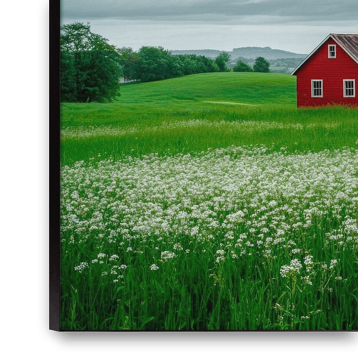Inmitten sanfter Hügel entfaltet sich ein Meer aus weißen Blüten, das die frische, grüne Wiese umschmeichelt. Ein leuchtend rotes Haus sticht mutig gegen den dramatisch bewölkten Himmel hervor und wirkt wie ein geladenes Geheimnis auf einem stillen, ländlichen Gemälde. Die Atmosphäre pulsiert mit der Magie eines bevorstehenden…