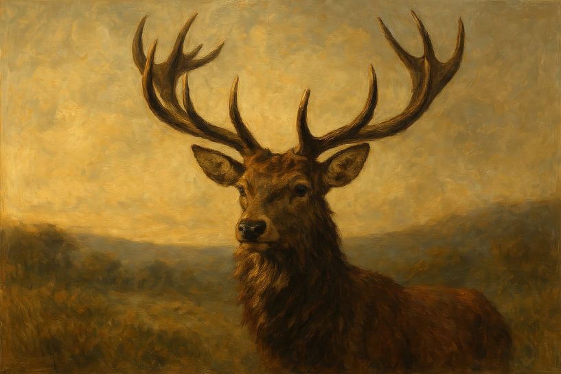 Ein Rothirsch mit imposantem Geweih steht im Mittelpunkt des warmen Abendlichts, während die nebligen Hügel in der Ferne verschwinden. Weiche Pinselstriche verleihen dem Fell Tiefe und betonen den Glanz der Äste des Geweihs. Der Farbkontrast zwischen den Goldtönen und dem kühlen, nebligen Hintergrund schafft Ruhe und Konzentration. Die…