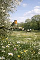 Bestelle dieses Landschafts-Wandbild Rotkehlchen im Frühling von Christina Bauer Photos als Reproduktion auf Leinwand, Alu-Dibond, als Poster, Fototapete oder Acrylglasbild.
