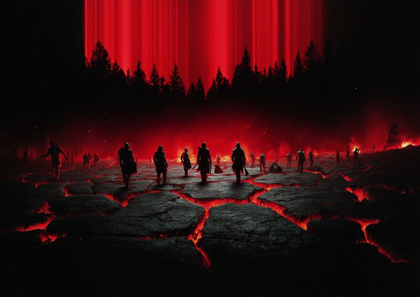 Eine dramatische und kontrastreiche digitale Illustration, die eine Szene der dunklen Fantasy-Kriegsführung zeigt. Silhouettierte Kriegerfiguren rücken über ein rissiges, vulkanisches Schlachtfeld vor, auf dem hellrotes, geschmolzenes Licht aus den Rissen unter ihnen leuchtet. Der Hintergrund wird von einer schwarzen Waldlinie unter…