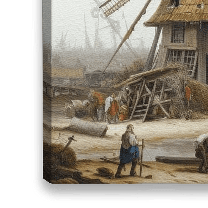 Das bild zeigt eine fiktive Szene aus den 1650er Jahren vom Hafen Rotterdam nach einem starken Sturm. Die Arbeiter sind dabei die Krane und Mühlen wieder zu reparieren.