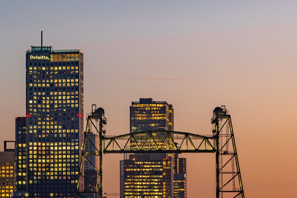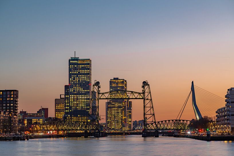 Foto der Hef in Rotterdam kurz nach Sonnenuntergang. Hinter der Hef sind die Erasmusbrücke, der Maastoren und Hochhäuser auf dem Wilhelminapier zu sehen. Die Hef ist die Eisenbahnbrücke über den Koningshaven und wurde nach dem Bau des Eisenbahntunnels überflüssig. Da die Brücke so prägend für Rotterdam war, wurde beschlossen, sie zu…