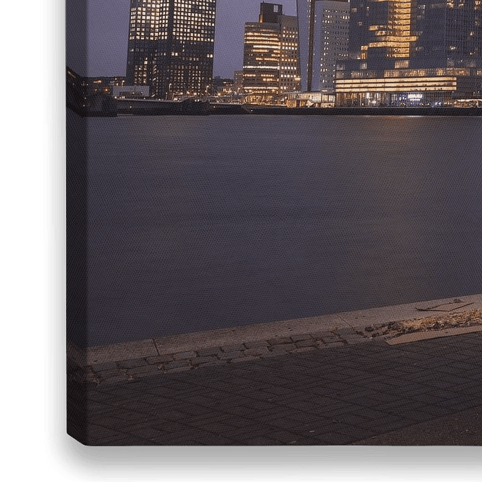 Eine schöne Aufnahme der Rotterdamer Skyline am Abend mit einem stimmungsvollen Laternenpfahl im Vordergrund. Eine lange Verschlusszeit auf einem Stativ lieferte ein Bild ohne Rauschen und mit weichem Effekt auf dem Wasser.