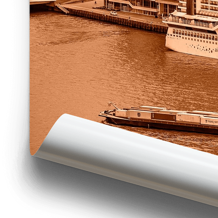 Ein monochromes Bild des Wilhelmina-Piers in Rotterdam. Ein großes Kreuzfahrtschiff liegt am Kreuzfahrtterminal an; ein Binnenschiff fährt auf der Fluss Nieuwe Maas vorbei.