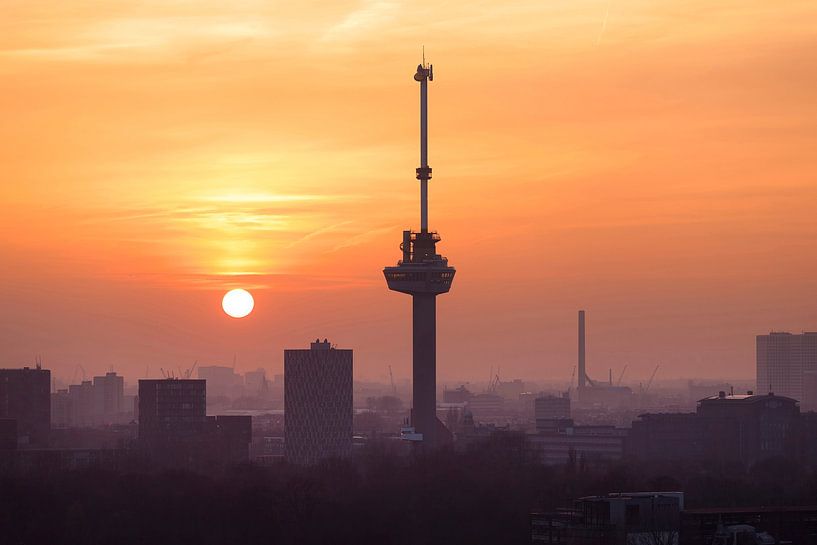 Ein schöner warmer und ruhiger Sonnenuntergang über der Stadt Rotterdam in den Niederlanden. Im Vordergrund der berühmte Euromast Turm.