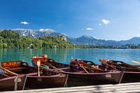 Ruderboote aus Holz am Bleder See in Slowenien mit Blick zur Burg von Bled