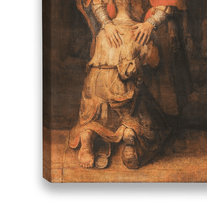 In diesem Gemälde präsentiert Rembrandt das Gleichnis vom verlorenen Sohn aus dem Neuen Testament. Wir sehen einen knienden jungen Mann, der von einem älteren Mann, seinem Vater, umarmt wird. Rechts sind drei Männer dargestellt, die schweigend zusehen. Der stehende Mann rechts ist der Bruder des verlorenen Sohnes.