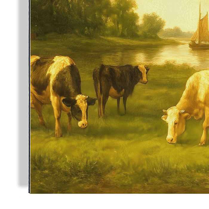 Dieses Gemälde strahlt die Atmosphäre der niederländischen Landschaft des Goldenen Zeitalters aus, eingefangen in einem warmen, goldenen Glanz. Im Vordergrund grasen friedlich Kühe im saftigen Gras, ihr Fell schimmert im sanften Sonnenlicht.