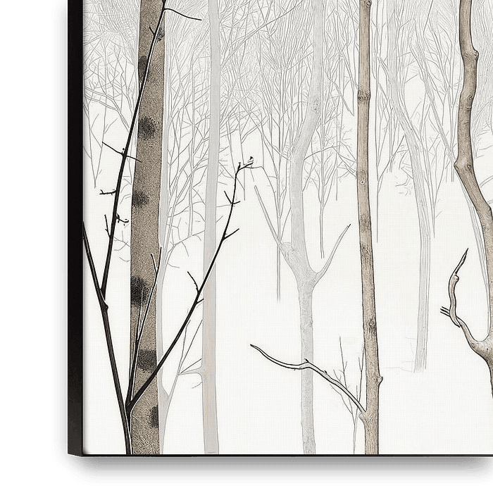 Ruhige, winterliche Szene, in der mehrere Vögel auf den nackten Ästen von Laubbäumen ruhen. Der überwiegend weiße Hintergrund suggeriert einen nebligen, kalten Tag, wobei die subtilen Grau- und Brauntöne der Bäume ein Gefühl von Tiefe und Ruhe vermitteln.