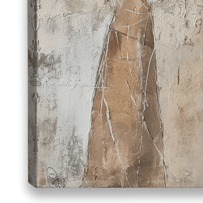 Still Gestalten Rust | Modern Rustic - Zwei stilisierte Figuren, die mit sparsamen Linien und Flächen subtil in Szene gesetzt sind, stehen im Mittelpunkt dieses Kunstwerks, das mit erdigen Farben und Strukturen spielt. Der Hintergrund aus verwittertem Beige und Braun, angereichert mit Texturen, verleiht Tiefe und ein Gefühl von…