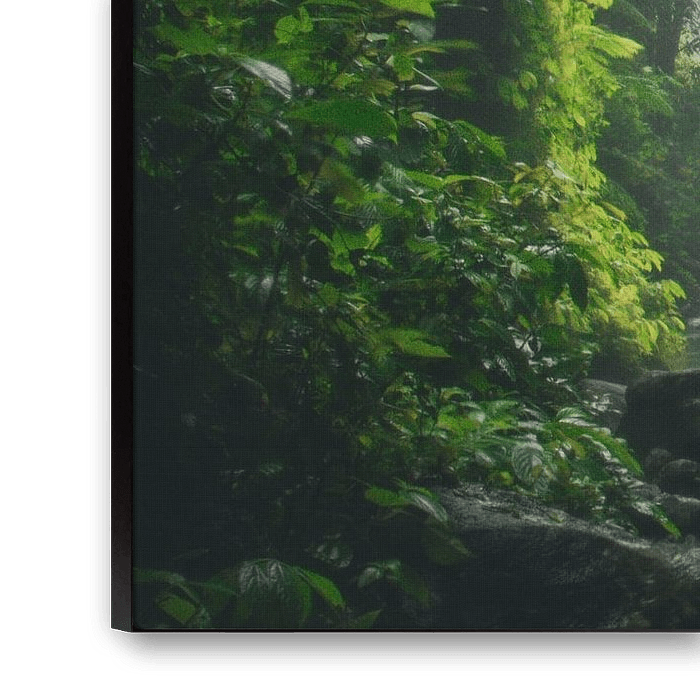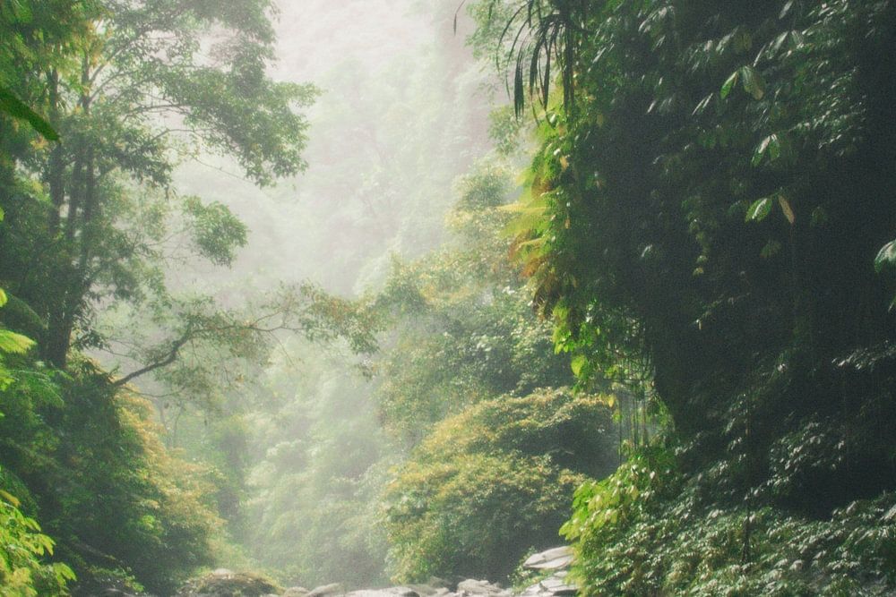 Im Dschungel von Bali plätschert ein kleiner Fluss leise dahin, umgeben von dem beeindruckenden Grün meterhoher Bäume und Pflanzen. In der Ferne ist ein tropischer Regen zu sehen, der die Sicht trübt.