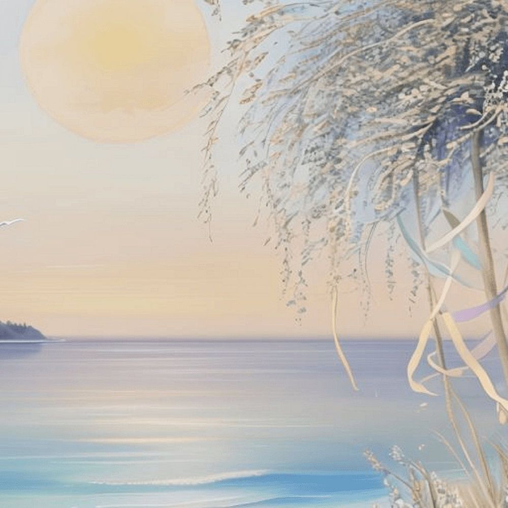 Dieses ätherische Gemälde fängt den stillen Zauber einer ruhigen Küstenlandschaft bei Sonnenuntergang ein. Das weiche, dunstige Licht der untergehenden Sonne taucht die Szene in ein warmes, sanftes Licht und schafft eine traumhafte Atmosphäre. Das ruhige, spiegelglatte Meer spiegelt den blassen Himmel wider, und seine Oberfläche ist von feinen Wellen gezeichnet, die sanft auf den unberührten weißen Sand plätschern. Im Vordergrund wiegt sich eine Gruppe zarter Bäume mit zarten Ästen, die mit pastellfarbenen Bändern geschmückt sind, die einen Hauch von Laune und Bewegung verleihen. An ihrem Fuße blühen Wildblumen in Lavendel- und Blautönen, die der Komposition einen Hauch von natürlicher Schönheit verleihen. Dieses Stück vermittelt ein Gefühl von Frieden, Einsamkeit und heiterer Kontemplation und ist damit die perfekte Ergänzung für jeden Raum, der ein beruhigendes und romantisches Ambiente schaffen soll.