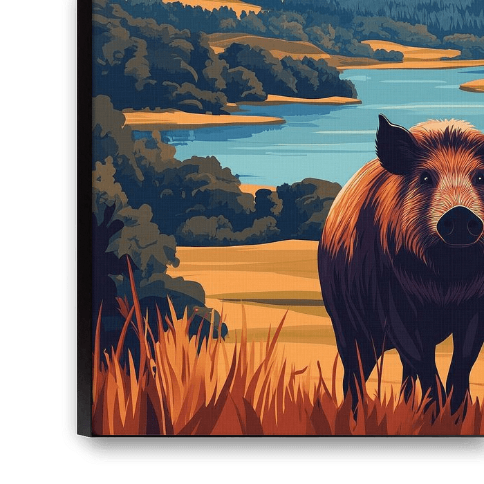 Dieses Werk zeigt ein Wildschwein, das im Mittelpunkt einer malerischen Hügellandschaft steht. Das Tier schaut den Betrachter ruhig an, während es von einer friedlichen Landschaft mit weiten Feldern, Wäldern und einem ruhigen See in der Ferne umgeben ist. Die warmen Töne der Erde und des Grases bilden einen schönen Kontrast zu den kühlen Blautönen des Himmels und der Hügel. Die Komposition fängt die Einfachheit und Ruhe der Natur ein, wobei die Anwesenheit des Wildschweins ein Element von wilder Schönheit und Kraft hinzufügt. Dieses Werk ist ein wunderbares Beispiel für eine stilisierte Naturillustration, die die Harmonie der ländlichen Landschaft auf moderne Weise darstellt.