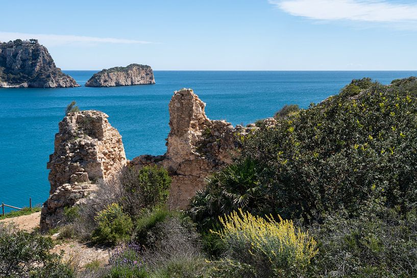 An der Mittelmeerküste in Jávea befinden sich auf einer Klippe die Ruinen einer historischen Festungsanlage. Unter einem klaren Himmel bietet sich eine wunderbare Sicht auf das Meer und die Steinmauern des Castillo de la Granadella, das von mediterranen Sträuchern und Kräutern umgeben ist. In der Vergangenheit wurde dieser exponierte…