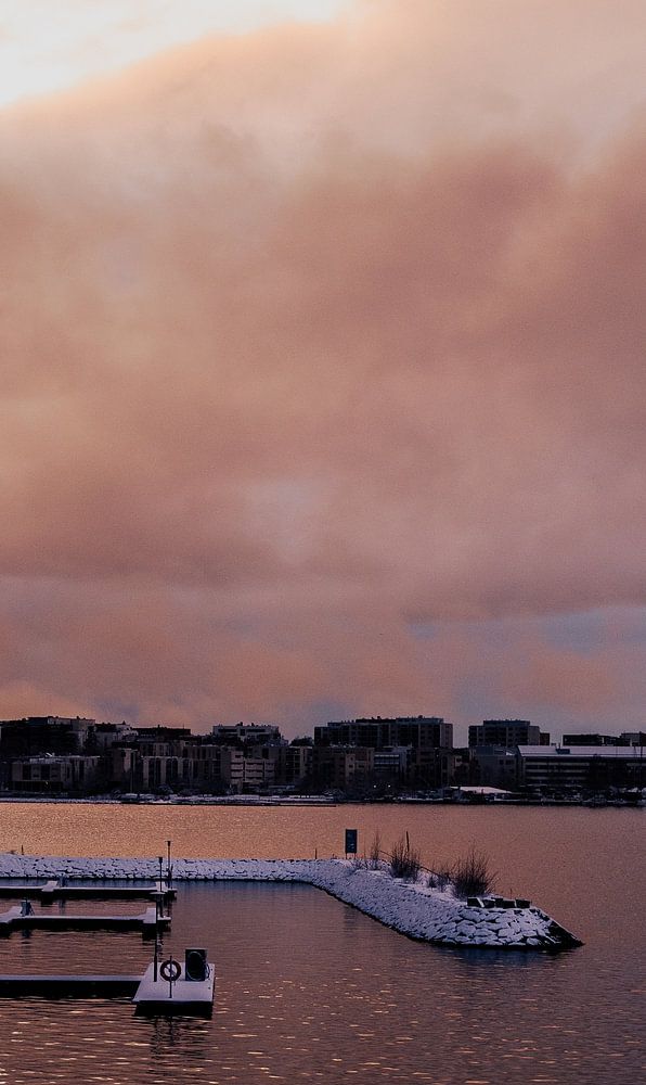 Nordische Ruhe über dem Waterfront-Viertel Ruoholahti in Helsinki, Finnland: roséfarbener Himmel, schneebedeckte Stege und sanft schimmerndes Wasser vor der klaren Skyline. Dieses Cityscape bringt skandinavische Klarheit und zeitlose Eleganz in moderne Wohn- und Arbeitsräume und funktioniert hervorragend als ausdrucksstarke Wandkunst.