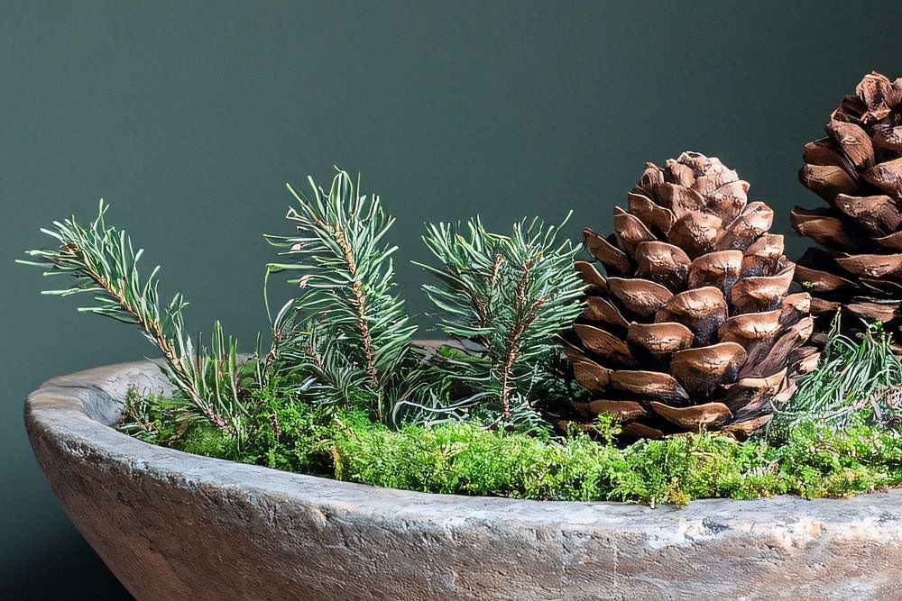 Dieses charmante Design bringt die Natur ins Haus: eine rustikale Steinschale, gefüllt mit grünem Moos und natürlichen Tannenzapfen. Die Schlichtheit des Designs in Kombination mit den erdigen Tönen und Texturen macht es zu einer perfekten Ergänzung für jede Einrichtung. Das Arrangement strahlt einen ruhigen und minimalistischen Stil aus, der gut zu japandischen oder skandinavischen Themen passt. Stellen Sie es auf einen Esstisch, ein Sideboard oder einen Beistelltisch, um eine beruhigende und natürliche Atmosphäre in Ihrem Zuhause zu schaffen. Ideal für die Feiertage oder um das ganze Jahr über einen Hauch von Natur in Ihre Innenräume zu bringen.